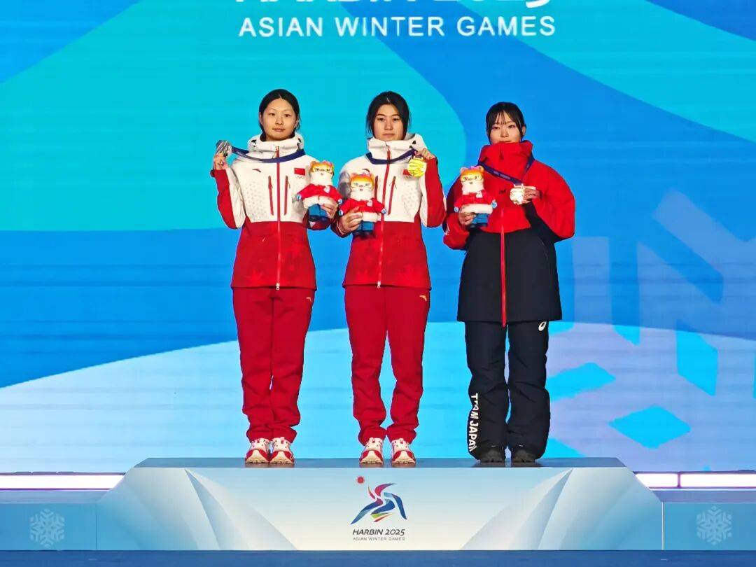 2025年2月10日,在第九届亚洲冬季运动会单板滑雪女子大跳台决赛中,四川选手熊诗芮(中)以164.00分夺取金牌,这是四川运动员在亚冬会历史上取得的首金。图为颁奖现场(赵颂佳 摄)