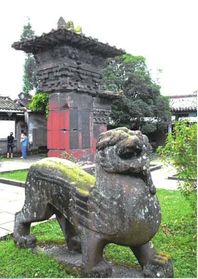 与石兽保存完好同样难得的是,在距高颐阙以北约两百处,高颐墓碑仍存。拨开齐腰深的蒿草,透过茂密的树丛,我又看见了仍然矗立的墓碑。它高近两米,宽约一米,可惜碑面字迹漫漶得已无法辨认。一般来讲,墓碑和陵寝在阙后面的中轴延长线上,至于延长多少,要看尊卑贵贱,如距此不远的芦山县樊敏阙。身为芦山县人的樊敏,历任青衣羌国(辖今雅安芦山一带)国丞、东汉巴郡太守,最后晋升为属国家级领导人的司徒,位列三公。像樊敏这般的显赫人物,级别比高颐高,因此据当地文物考古工作者推测,从樊敏阙向后可能延长几里路才是陵寝。