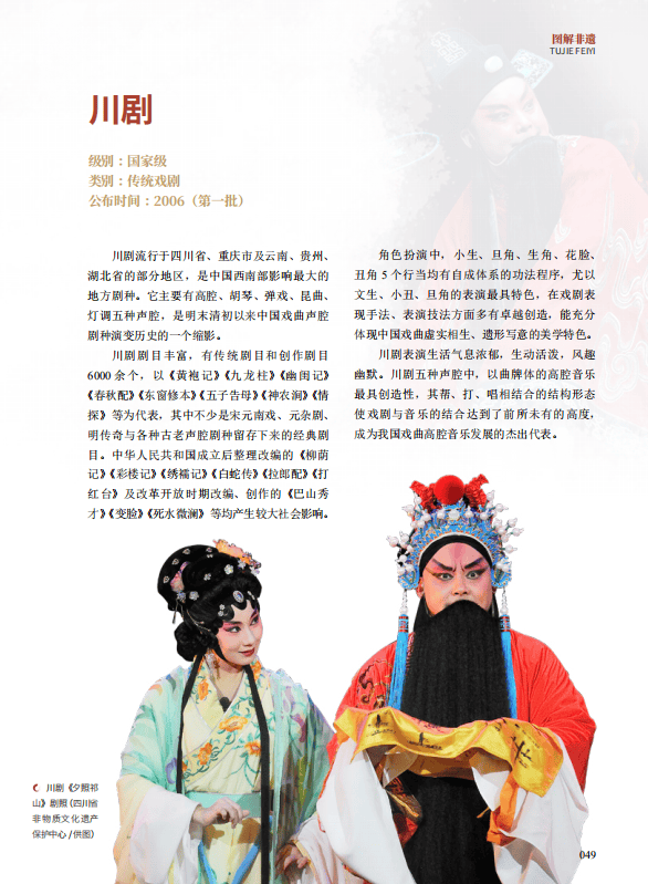川剧流行于四川省、重庆市及云南、贵州、湖北省的部分地区,是中国西南部影响最大的地方剧种。它主要有高腔、胡琴、弹戏、昆曲、灯调五种声腔,是明末清初以来中国戏曲声腔剧种演变历史的一个缩影。