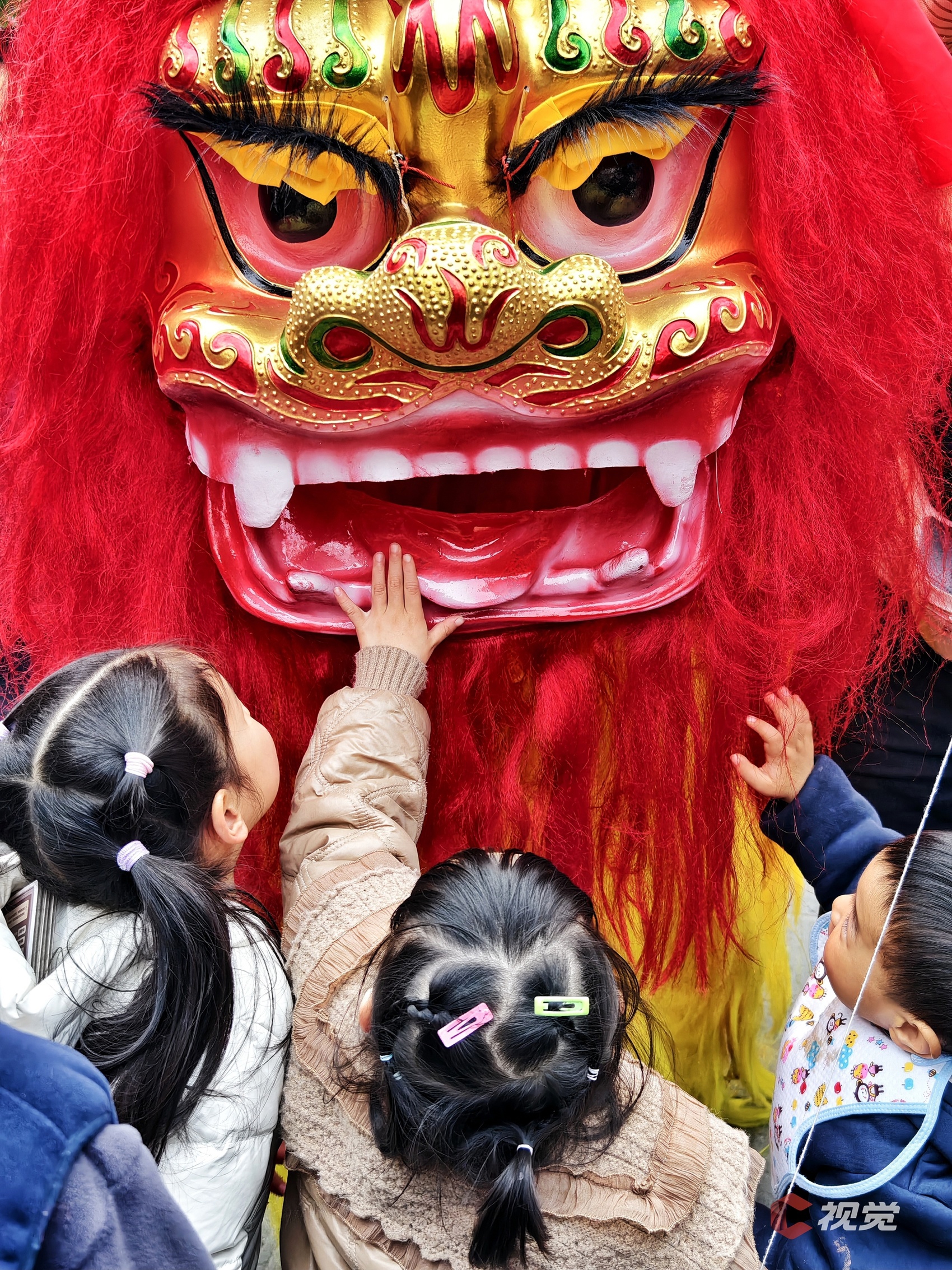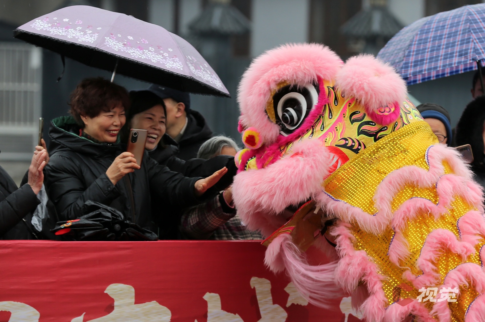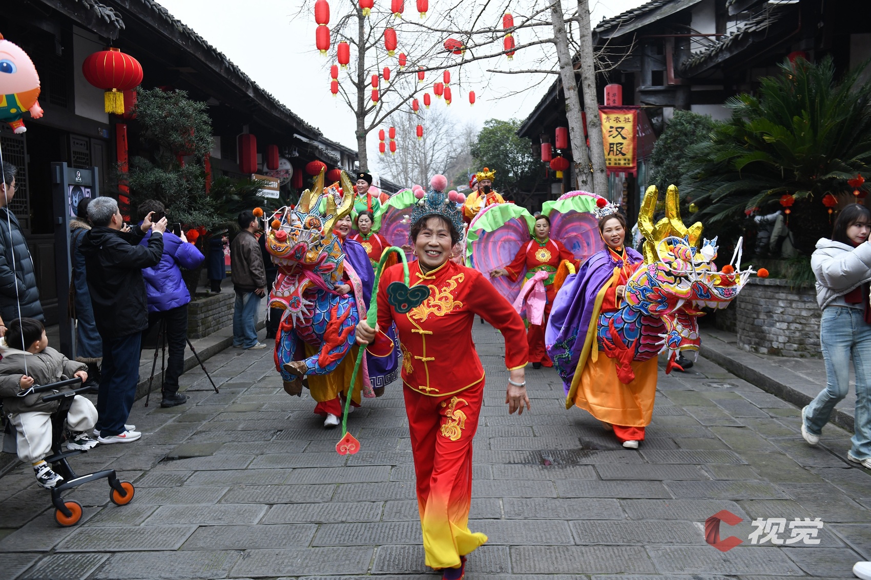 1月7日腊八节,阆中市丝绸广场举行“2025龙狮闹新春阆中古城过大年”展演活动,市民拍照留念。C视觉 彭银高 摄