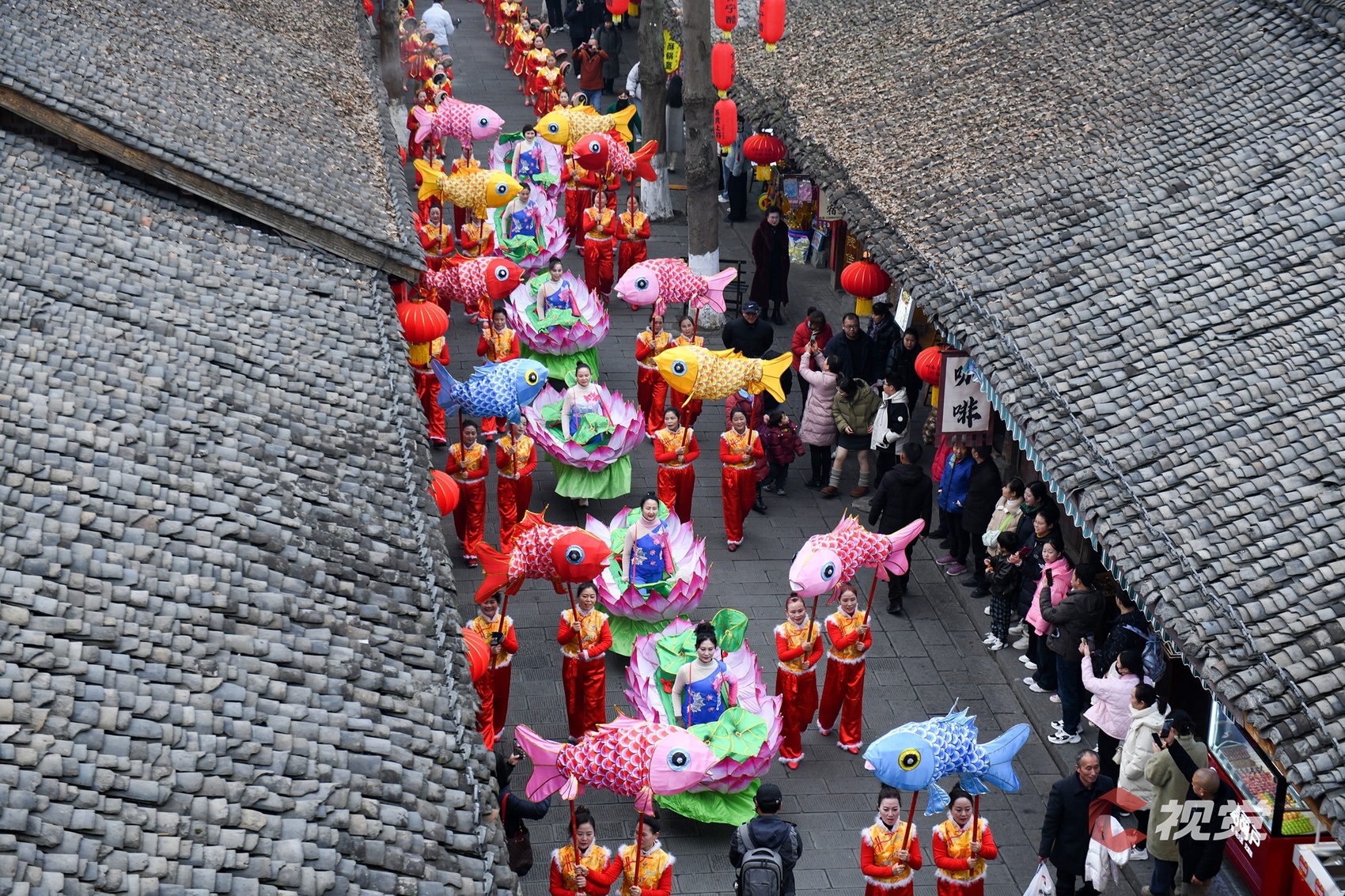 1月22日是小年,彩莲船非遗民俗表演队伍在古城街道上行进,吸引了游客追着观看。C视觉 王玉贵 摄