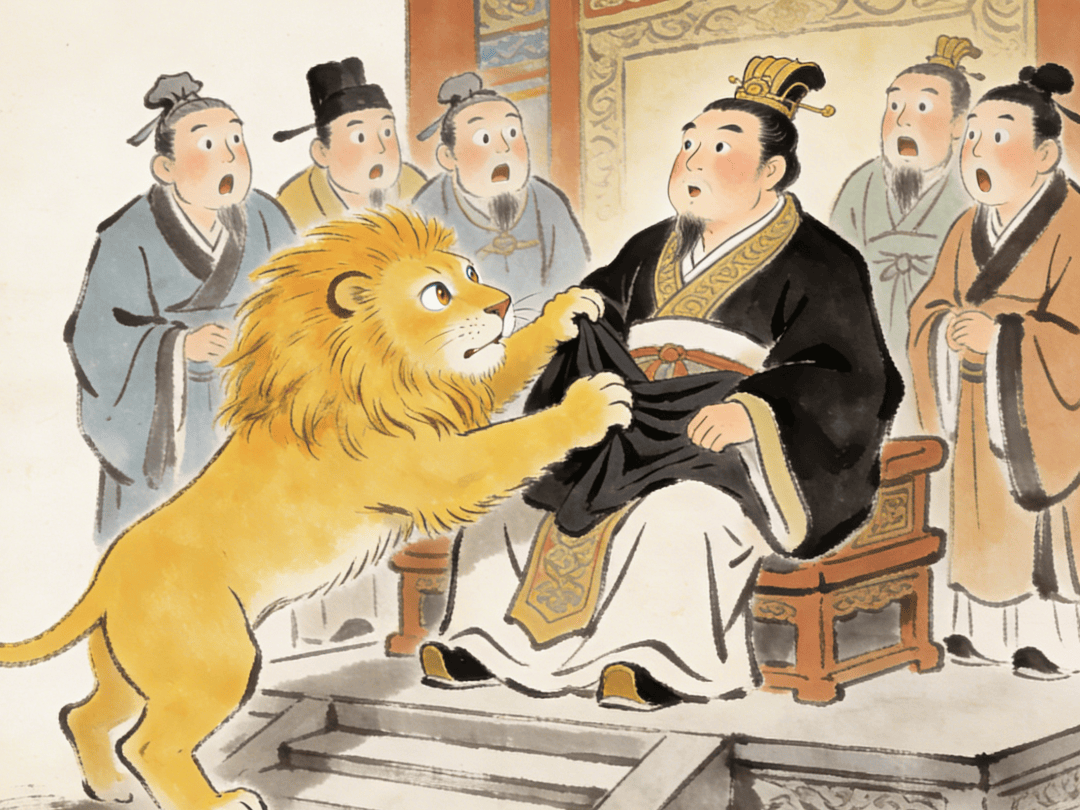 一天,尧帝在殿上与大臣们商量国事,金狮跑进殿来讨封,因不能说人话,就在殿下绕来绕去。尧帝不晓得这金狮来做啥子,没有理它。金狮着急,扑上殿抓尧帝的衣服。殿上的和合二仙看见,忙用神帚和金元宝把金狮赶下殿跪下,向尧帝奏道:“这金狮是来讨封,不是伤害吾主的。”尧帝就封金狮为百兽之王,管辖百兽,不准危害百姓,保四方平安,每年春节,到凡间受万人香火。敕封完后,金狮磕头谢恩高高兴兴离去。