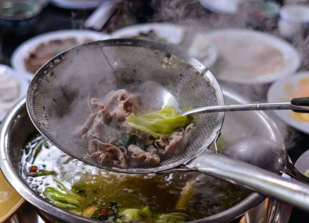 这锅“药膳高汤”的精妙之处,在于对牛杂的“点化”功夫。牛肚、牛肠、牛心、牛舌、牛头皮、牛蹄筋......这些粗犷食材在沸汤中快速汆烫,短短几十秒便脱胎换骨。滚烫药汤瞬间锁住鲜嫩,逼出异香。出锅后,或配干碟蘸食,或连汤带肉享用,皆是人间美味。