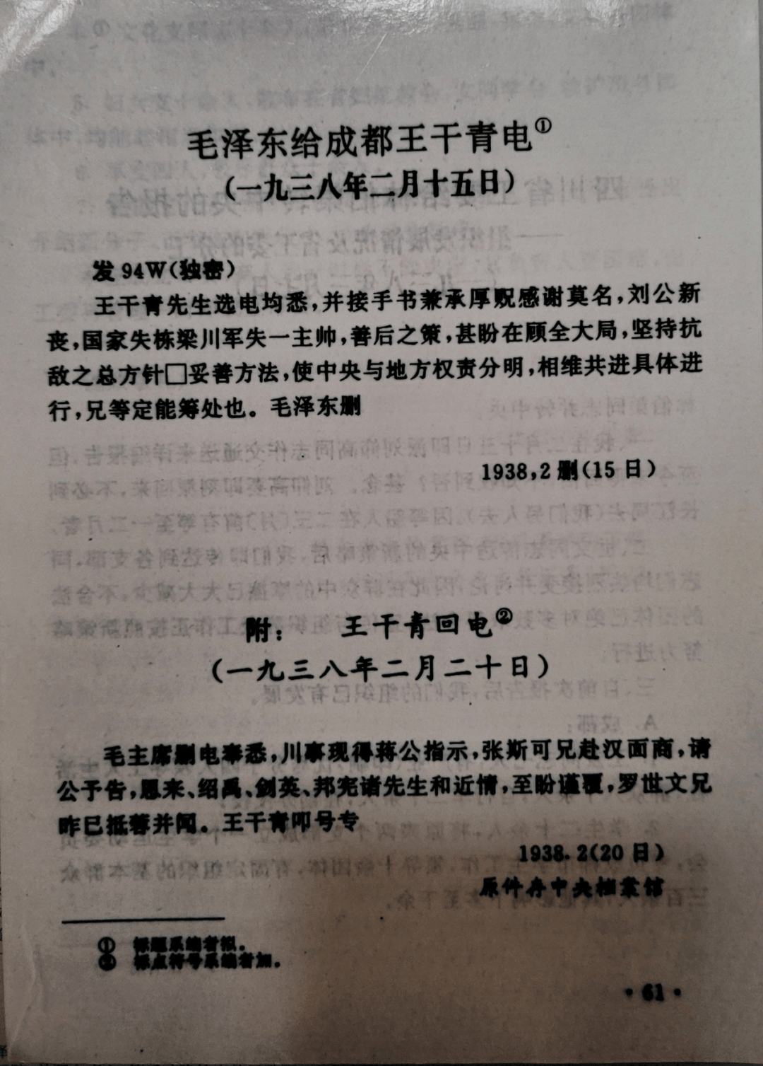 在延安的四个多月里,王干青有幸多次得到毛泽东主席的亲切接见。王干青向中共中央、毛主席转达刘湘以及所部川军矢志参加抗战的坚定决心。临行回四川前夕,毛主席赠予他一张亲笔题字的全身影照。返川之后,他难掩内心澎湃,赋诗一首呈予毛主席。9月底,王干青自延安回到四川后,依旧心系革命事业,积极引荐了一批有志青年,诸如杨鸣皋、易诚、王泽丰等人奔赴延安的抗日军政大学、陕北公学深造学习。与此同时,受党组织的重托,王干青还为延安招聘了一批机械工人、印刷工人,为革命根据地的建设与发展注入了新鲜血液。