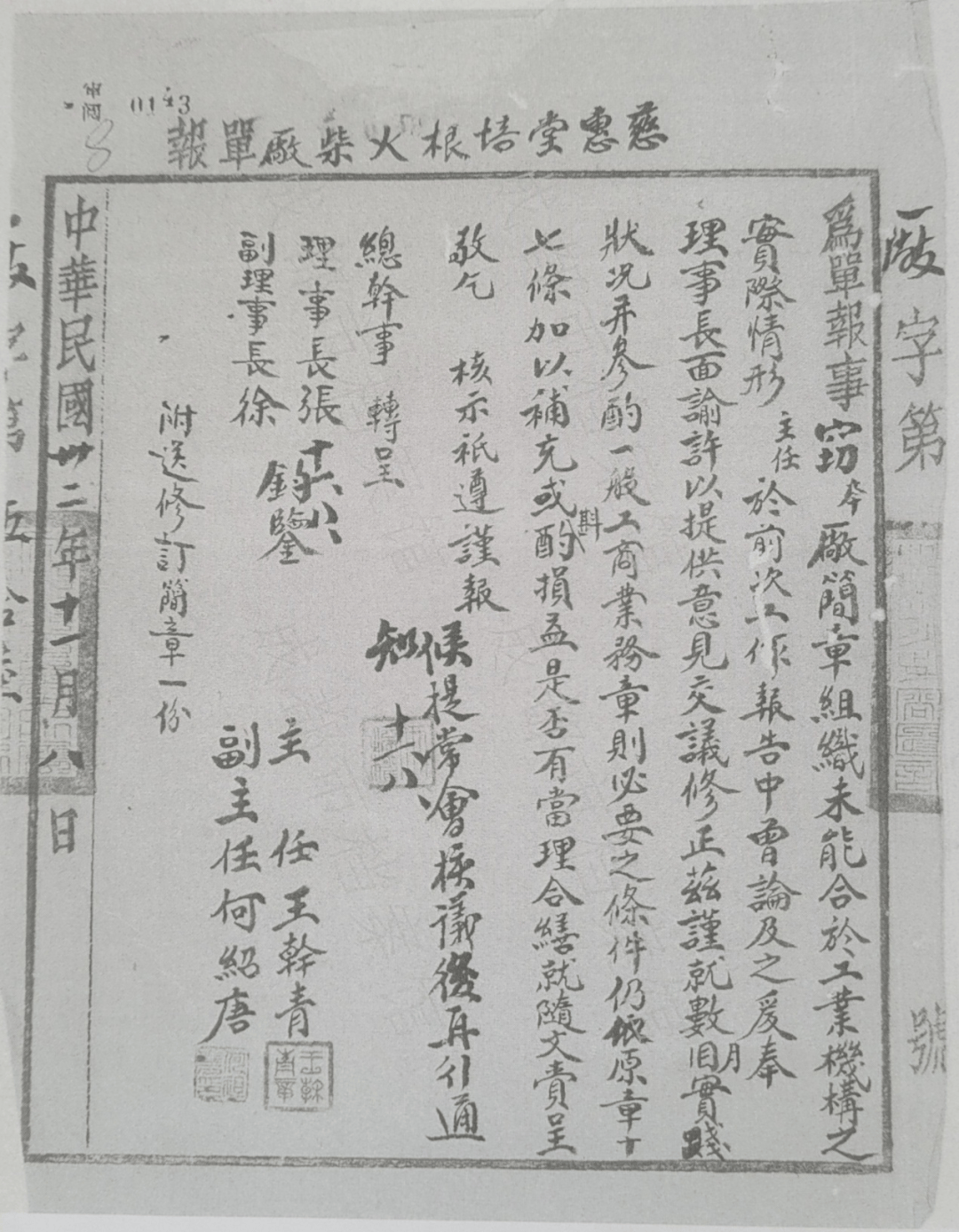 王干青担任培根火柴厂主任期间给慈惠堂理事长上报的文件