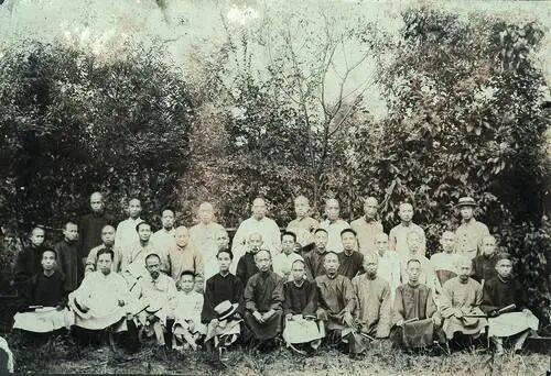 1926年夏天,王干青(第二排左六)在绵竹南郊何家花园召集36名国人筹备拥护三大政策的国民党(左派)县党部集体合影。