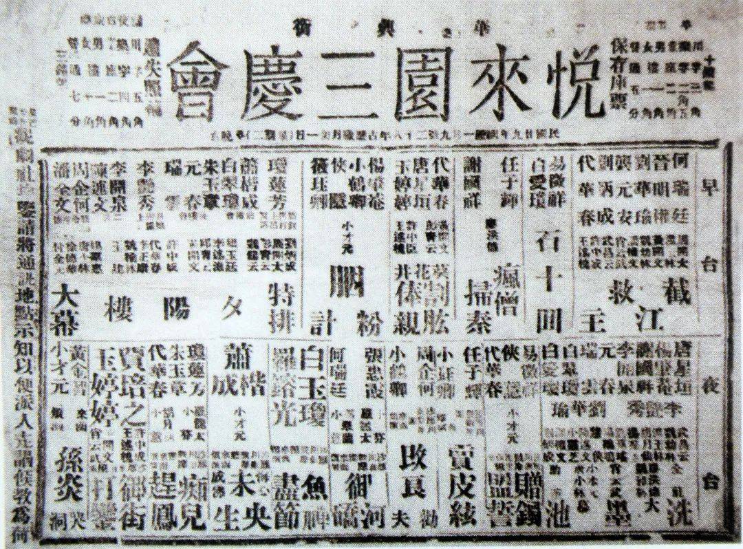 1940年,三庆会在成都举办成立三十周年庆典,其主题为“三庆会,重兴大光明”。萧楷成对这次庆典可谓精心组织,先是刊出启事,向社会征求诗词书画以扩大影响。文化知名人士积极响应,先后有张大千、黄敬余、林君墨、余中英等题诗题词。后又举行三天的盛大演出。演出的戏目极有意思,分别用八出戏《三仙赐枣》《庆贺乐台》《会友请援》《重台分别》《兴汉图》《大闹齐庭》《光武山》《明珠缘》凑成庆典主题。庆典演出非常成功,极大地提振了三庆会全体艺人的精神。