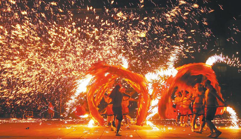 1月31日晚,民间艺人在南充市蓬安县相如广场表演国家级非物质文化遗产“火龙钢花”。伴随着喜庆的乐曲,温度高达1500摄氏度的铁水被拍打至高空,瞬间绽放成朵朵“钢花”漫天飞舞,舞龙者在飞舞的火花间舞动穿梭,演绎出“人在龙中舞,龙在火中飞”的壮观画面,让广大市民感受到浓浓年味。 刘永红 摄(C视觉)