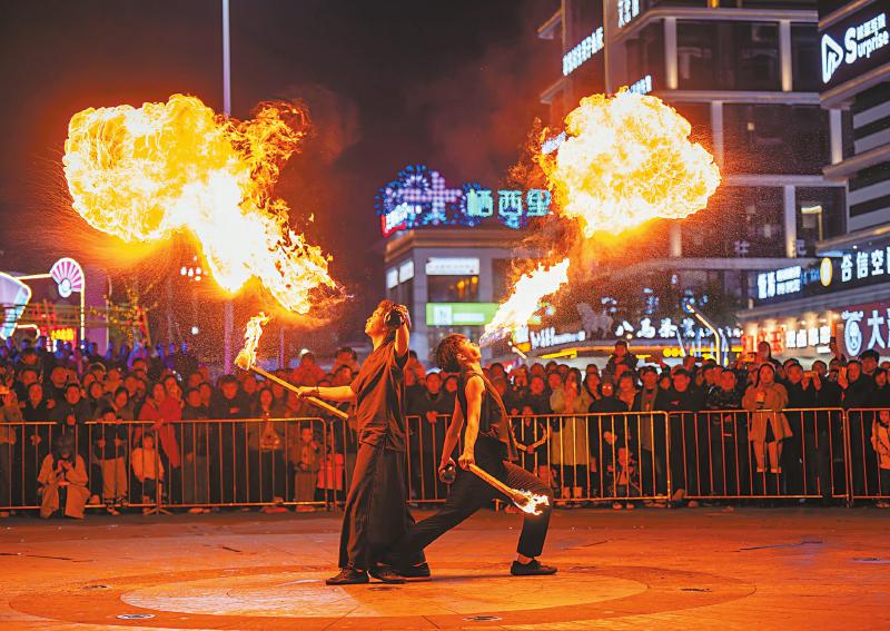 12月24日,在眉山市仁寿县栖西里商圈,艺人在进行表演。 潘帅 摄(C视觉)