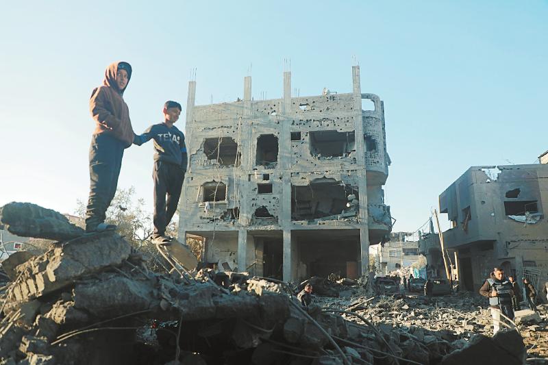 当地时间一月三日,在加沙地带中部迈加齐难民营,当地民众查看被以军袭击毁坏的房屋。新华社发(里泽克·阿卜杜勒贾瓦德摄)