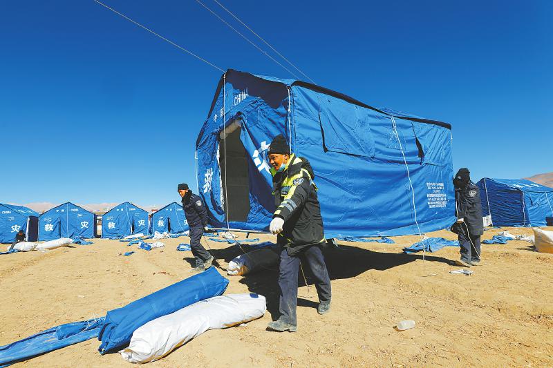 1月8日,在日喀则市定日县措果乡雪珠村安置点,救援人员帮助受灾群众搭建帐篷。新华社记者 沈伯韩 摄