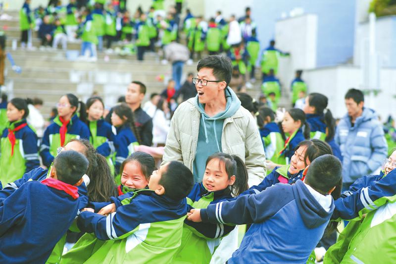 成都市双流区黄甲小学教师为参加拔河比赛的学生加油。