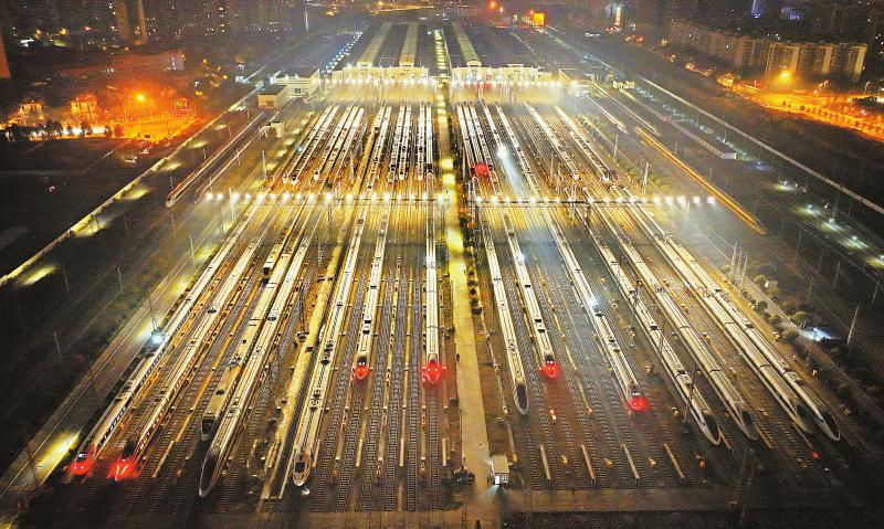 1月13日凌晨,检修完毕的动车组停在中国铁路成都局集团有限公司成都动车段存车场内,准备迎战即将开启大幕的春运。2025年春运1月14日开启,至2月22日结束,为期40天。连日来,各地加强交通运输设施设备检查维修,确保春运安全运行。四川日报全媒体记者 李向雨 摄