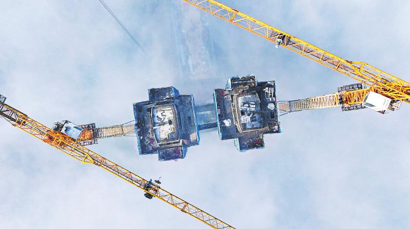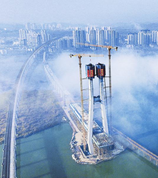 1月12日,成(都)达(州)万(州)高铁遂宁涪江特大桥主塔巍峨耸立,工人正在为塔顶混凝土浇筑作业作准备。