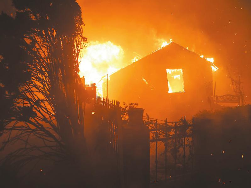1月7日,在美国加利福尼亚州南部洛杉矶县沿海社区帕西菲克帕利塞兹,山火吞噬房屋。 新华社发(邱晨 摄)
