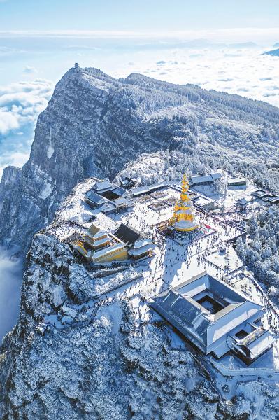 1月11日,乐山市峨眉山景区雪峰和云海相映成趣,吸引众多游客前来。