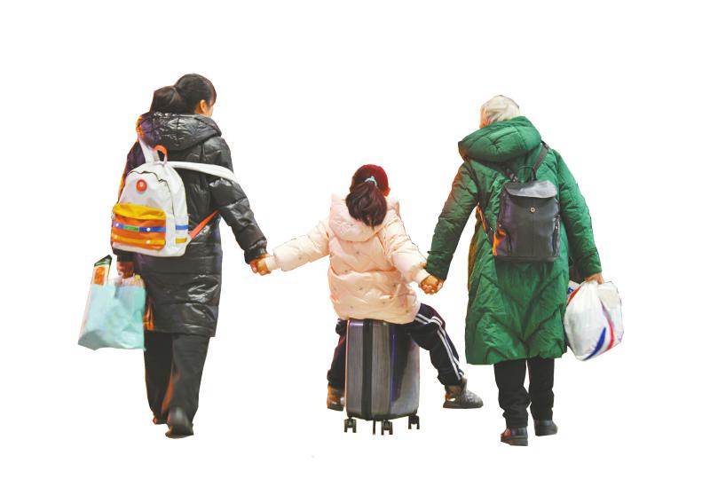 一家三口手牵手奔向春运旅途。四川日报全媒体记者 华小峰 摄