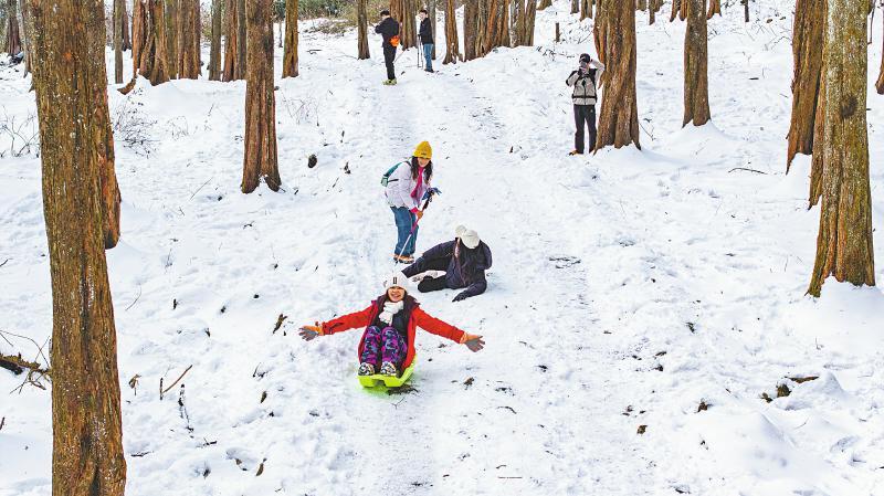 1月12日,成都崇州市文井江镇琉璃坝被皑皑白雪覆盖,上山的游客在雪地里尽情撒欢。
