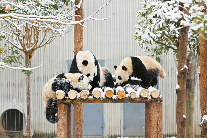 1月8日,汶川县耿达镇雪后初晴,中国大熊猫保护研究中心卧龙神树坪基地里的大熊猫在雪中玩耍。