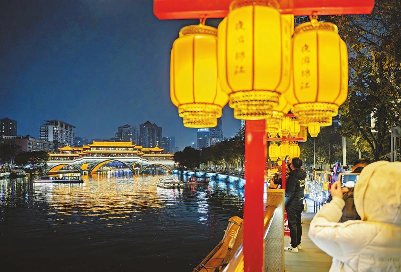 1月13日,游客在成都市锦江边观看游船夜游锦江。近期,成都“夜游锦江”航线入选“国内水路旅游客运精品航线典型案例——特色文化游”。