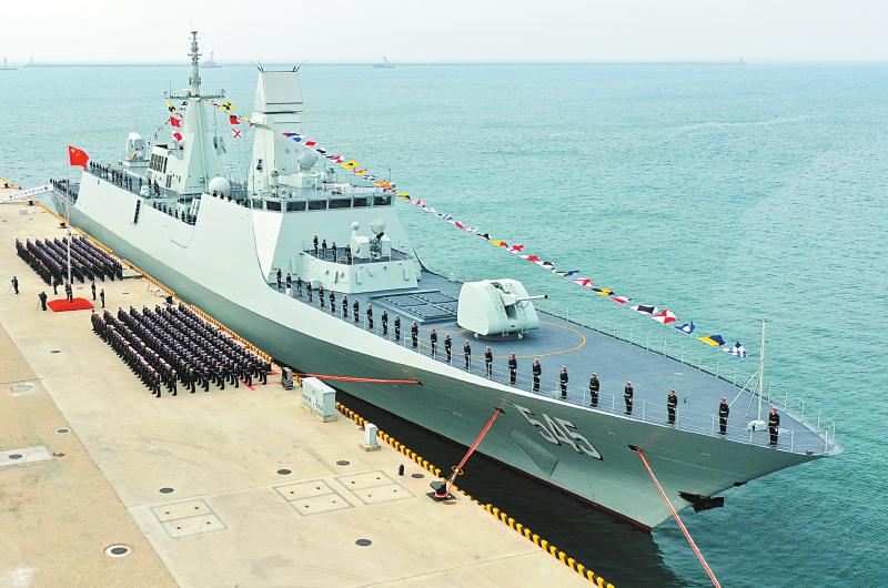 1月22日上午,中国人民解放军海军054B护卫舰首舰漯河舰在青岛某军港交接入列(无人机照片)。 新华社发(蒲海洋 摄)