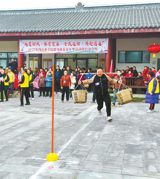 1月22日,“川渝一家亲,体育大拜年”的“土味”运动会在内江隆昌市石燕桥镇三合村双昌园综合服务中心拉开帷幕。图为挑箩筐送粮食比赛。四川日报全媒体记者 薛剑 摄
