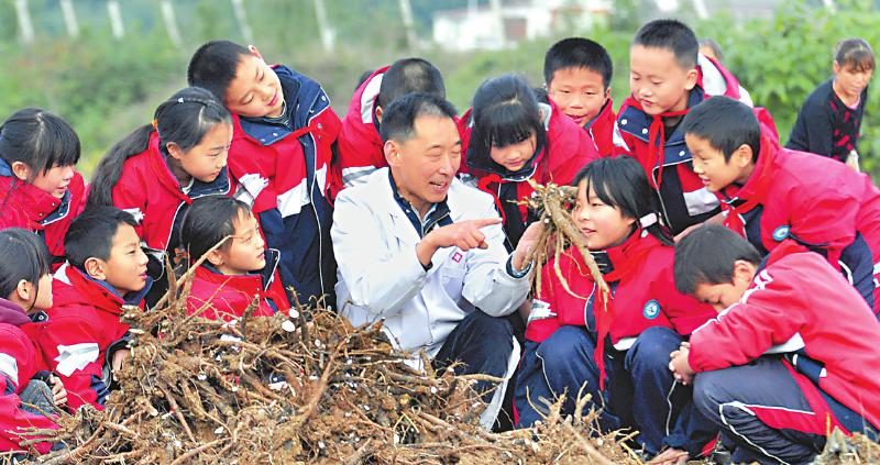 绵阳市梓潼县仙峰小学学生在医务人员指导下辨识芍药、了解芍药药性。 成和平 摄