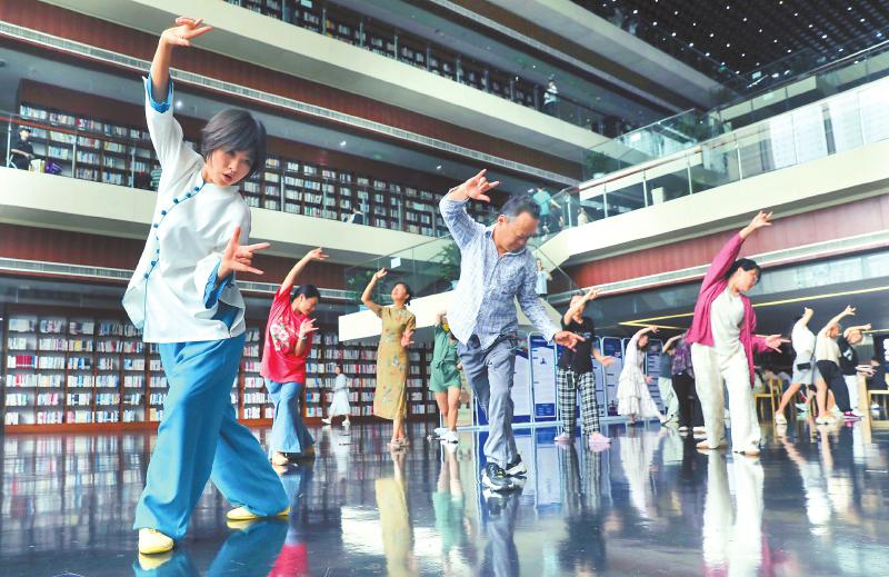 市民在省图书馆举办的“养生吧·青年”活动中体验中医养生功法。 省中医药局供图