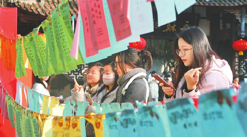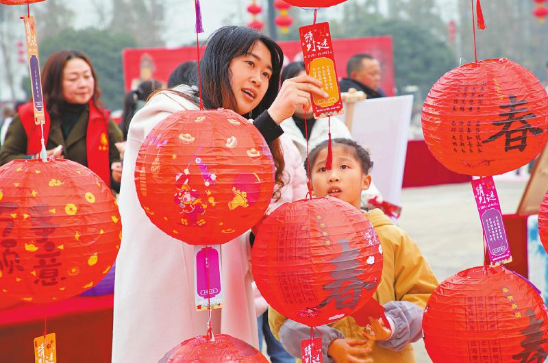 市民游客在眉山三苏祠博物馆外猜灯谜。