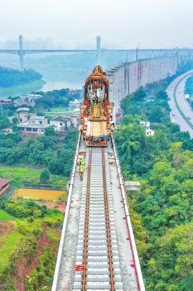 1月13日,在泸州市江阳区,隆黄铁路隆叙段扩能改造工程沱江特大桥施工现场,正在进行箱梁架设。高耸的桥墩,与G76厦蓉高速公路和渝昆高铁川渝段“同框”。