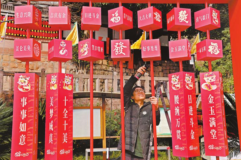 金堂县以“逛烟火五凤溪,过古镇非遗年”为主题迎接新春佳节,主要展示打铁花、鱼灯、皮影戏、杂技等。图为1月20日工作人员在布置活动场所。 王金国 摄(C视觉)