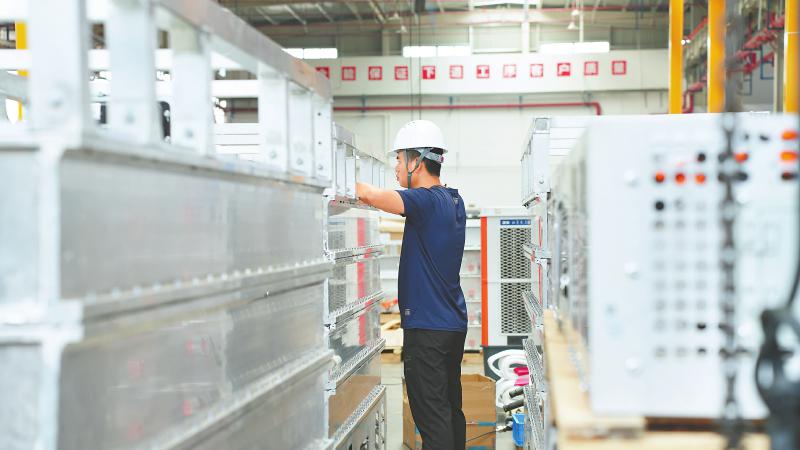 位于宜宾三江新区东部产业园能源港的智锂物联生产基地内,工人在组装重卡换电站设备。 罗顺 摄