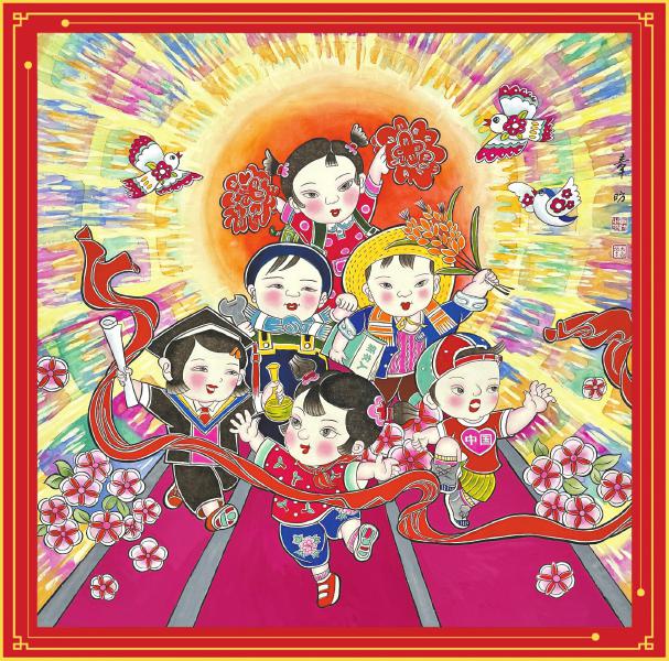 我们都在努力奔跑,我们都是追梦人(绵竹年画),尺寸:90cm×90cm。章昉 作