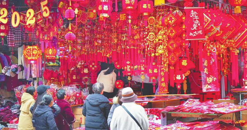 佳节将至,遂宁街头年味浓郁,蛇年元素新年装饰随处可见,大小商超集市上,各色年货也日渐热销。图为市民在遂宁新市场选购新年装饰品。 遂宁观察 刘益静 摄