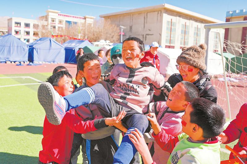 西藏定日6.8级地震发生20天后,灾区震后安置工作正有条不紊地进行着。在春节即将到来之际,中国科学院心理研究所联合其他相关机构为长所乡嘎旦村和曲洛乡措昂村的孩子们精心组织了一场地震灾区的足球比赛。这场足球比赛让孩子们感受到运动的快乐,也为他们的心理重建和健康成长注入新的活力。 新华社记者 晋美多吉 摄