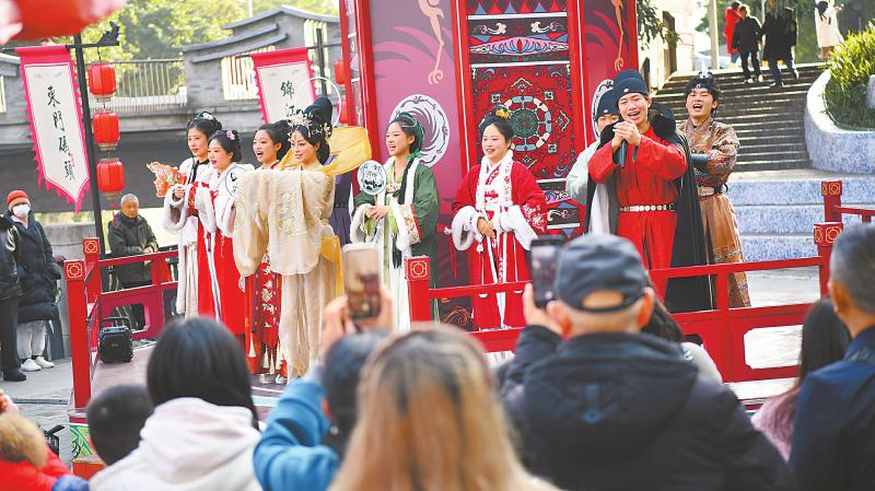 一月二十八日,成都东门码头舞台上演员身着汉服向游客拜年。四川日报全媒体记者 向宇 摄