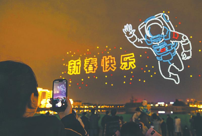1月31日晚,市民在绵阳金西湖用手机拍下精彩的无人机灯光秀。张波 摄(C视觉)