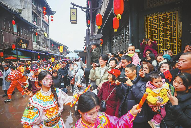 2月1日,遂宁市船山区龙凤古镇上演非遗大游演,现场为游客带来非遗代表性项目汕头英歌舞。刘昌松 摄(C视觉)