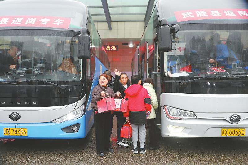二月一日,武胜县务工人员坐上开往广东的返岗专车。武胜县农民工服务中心供图