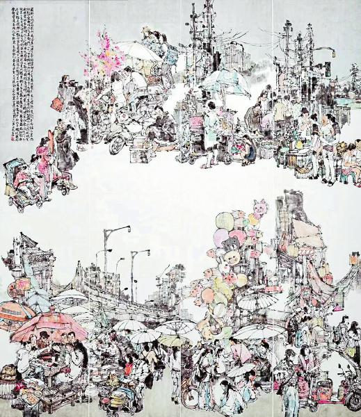 再来成都的街头走一走(中国画),尺寸:210cm×180cm。 钱磊 作