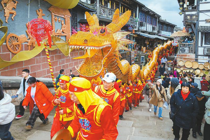 1月31日,成都邛崃平乐古镇竹龙表演让游客感受到传统文化的魅力。 周静 摄(C视觉)