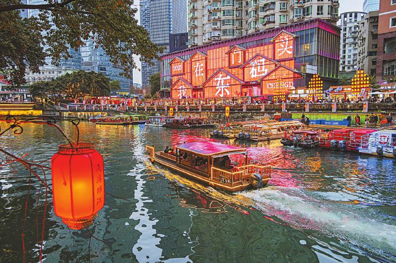 2月3日,成都夜游锦江热度不减。游客登船夜游,锦江波光粼粼,两岸灯火璀璨倒映水面,宛如一幅梦幻画卷。 王瑞林 摄(C视觉)