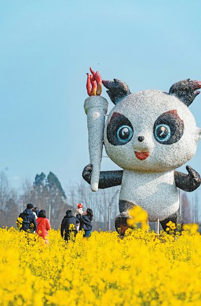 2月3日,立春,成都崇州市白塔湖旅游专线网红景点火炬熊猫打卡处的油菜花已经盛开,吸引不少游客前来赏花。李旭 摄(C视觉)