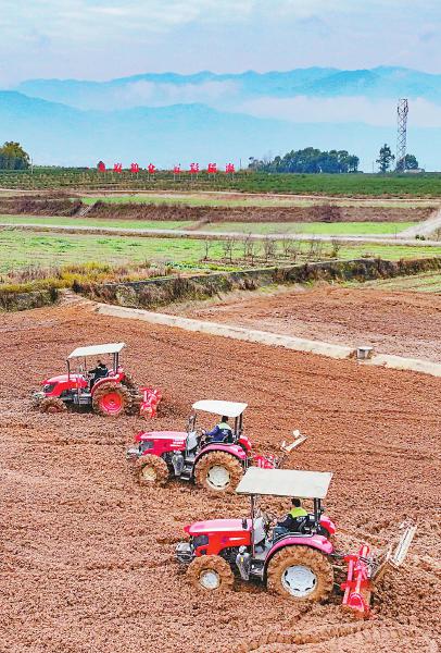 2月3日,广安华蓥市华龙街道东方村村民驾着“铁牛”在田间“犁春牛”,翻耕农田迎接立春。“犁春牛”是川东地区的传统民俗活动。邱海鹰 摄(C视觉)