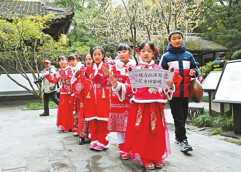 2月4日,成都市杜甫草堂内,福娃为游客送福。 王福明 摄(C视觉)