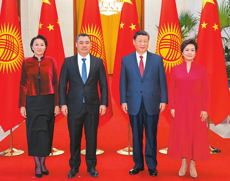 二月五日上午,国家主席习近平在北京人民大会堂同来华进行国事访问的吉尔吉斯斯坦总统扎帕罗夫举行会谈。这是习近平和夫人彭丽媛同扎帕罗夫和夫人扎帕罗娃合影。新华社记者丁林摄