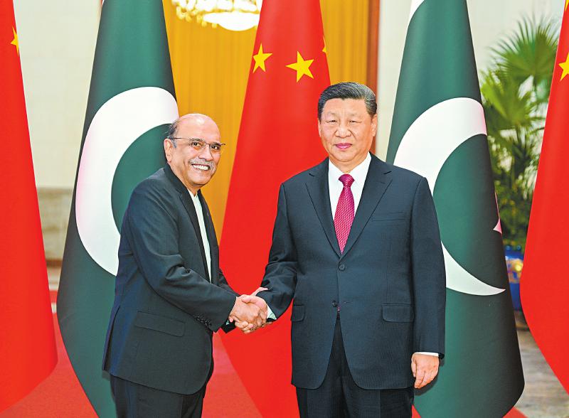 二月五日下午,国家主席习近平在北京人民大会堂同来华进行国事访问的巴基斯坦总统扎尔达里举行会谈。这是习近平同扎尔达里握手。新华社记者李学仁摄