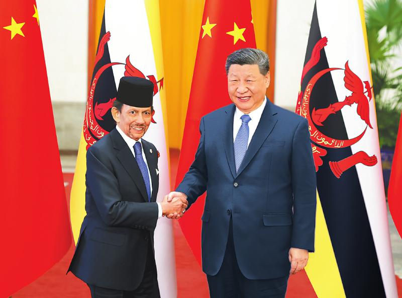 二月六日上午,国家主席习近平在北京人民大会堂同来华进行国事访问的文莱苏丹哈桑纳尔举行会谈。这是习近平同哈桑纳尔握手。新华社记者 黄敬文 摄
