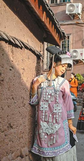 2月6日,游客身着彝族服饰在大石板古村拍照留念。四川日报全媒体记者 何海洋 摄
