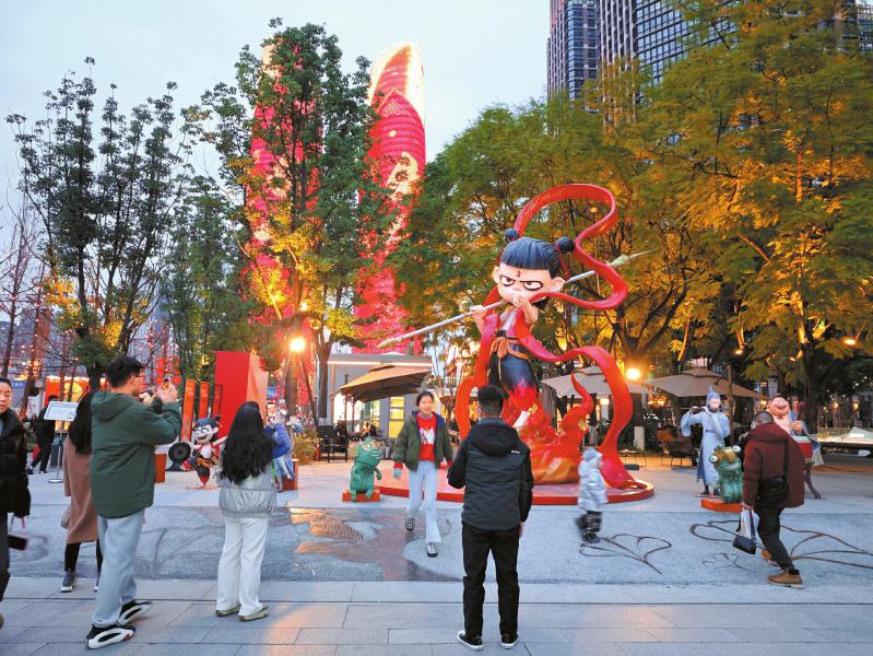 成都市交子大道与益州大道北段交会处的《哪吒之魔童闹海》人物造型,吸引不少市民打卡。 胡大田 摄